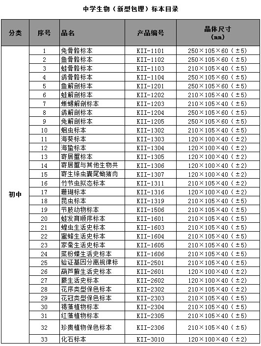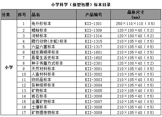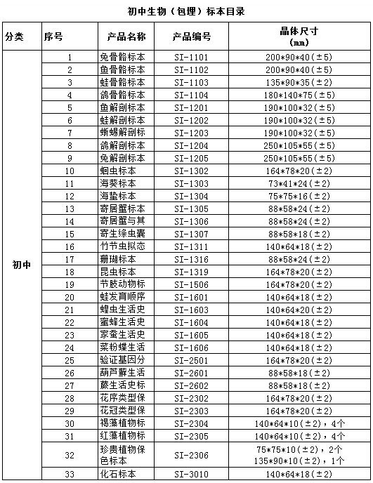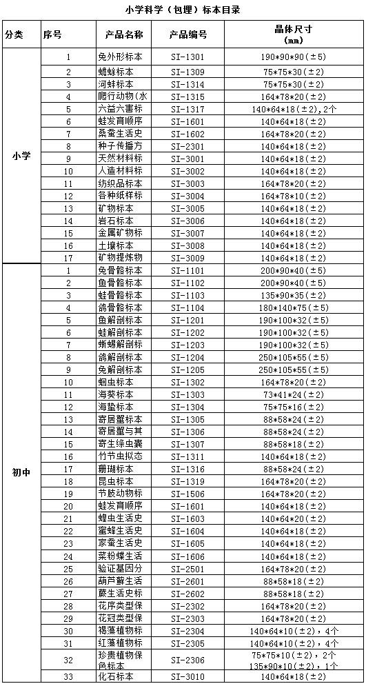 中小學(xué)標(biāo)準(zhǔn)配備系列包埋標(biāo)本涵蓋了國(guó)家中小學(xué)標(biāo)準(zhǔn)配備標(biāo)本要求的所有標(biāo)本品種,包括植物外形、植物生活史、植物結(jié)構(gòu)、動(dòng)物外形、動(dòng)物生活史、動(dòng)物結(jié)構(gòu)、動(dòng)物骨骼、動(dòng)物解剖,礦物等標(biāo)本產(chǎn)品。產(chǎn)品符合國(guó)家教育部行業(yè)標(biāo)準(zhǔn)、企業(yè)標(biāo)準(zhǔn)、以及行業(yè)通行的安全標(biāo)準(zhǔn),與教學(xué)大綱緊密配套,是中小學(xué)自然生物課堂的直觀教材和先進(jìn)教學(xué)用具。