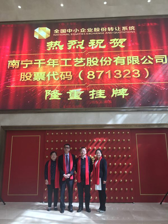 2017年5月5日,在北京金融街金陽(yáng)大廈內(nèi),隨著開(kāi)市寶鐘的敲響,南寧千年工藝股份有限公司(企業(yè)簡(jiǎn)稱:千年工藝,股份代碼:871323)在全國(guó)中小企業(yè)股份轉(zhuǎn)讓系統(tǒng)成功掛牌上市,成為廣西首家正式登陸新三板資本市場(chǎng)的工藝制造企業(yè),這是總公司在發(fā)展進(jìn)程中的一個(gè)重大里程碑!