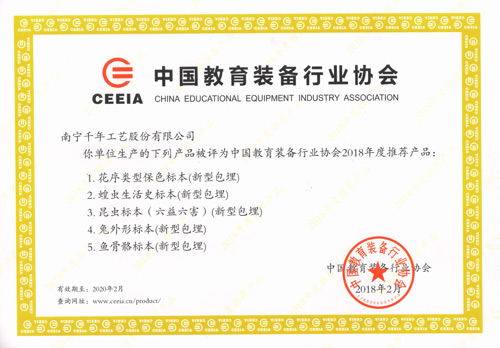 通過專家評(píng)委層層篩選,南寧千年工藝股份有限公司生產(chǎn)的“千帆”品牌新型包埋標(biāo)本:花序類型保色標(biāo)本(新型包埋)、蝗蟲生活史標(biāo)本(新型包埋)、昆蟲標(biāo)本(六害六益)(新型包埋)、兔外形標(biāo)本(新型包埋)、魚骨骼標(biāo)本(新型包埋),共5款產(chǎn)品榮獲中國教育裝備行業(yè)協(xié)會(huì)2018年度推薦產(chǎn)品。