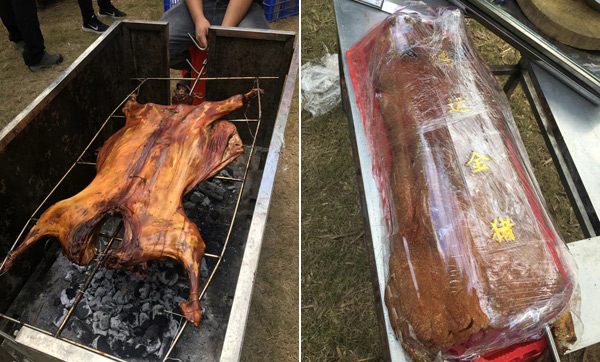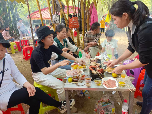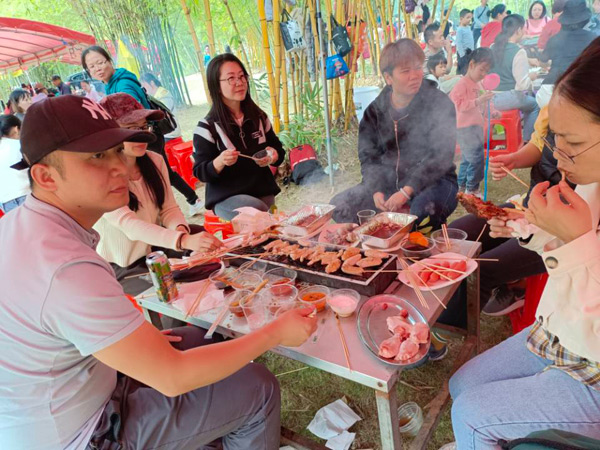 11:30體育運動結束后,大家來到燒烤場進行自助燒烤。燒烤場座落在綠蔭濃濃的竹林中,雖是冬日,卻煦日暖暖,溫和的陽光打在竹葉上,落下斑駁的日影,清風襲來,沁人心肺。燒烤場里飄香四溢的烤全羊、外酥里嫩的烤香豬、肥肥的雞腿、嫩嫩的雞翅、勁頭十足的牛肉丸,還有火腿、茄子、玉米、青椒等早已備好,此時大家早已饑腸轆轆,便迫不急待地動起手來,“自力更生”,喂飽自己的肚子! 大家團坐在烤爐旁,你遞個調料,我刷下辣醬,互幫互助,默契盡在不言中,其實,這也是一種心靈的溝通與交流。